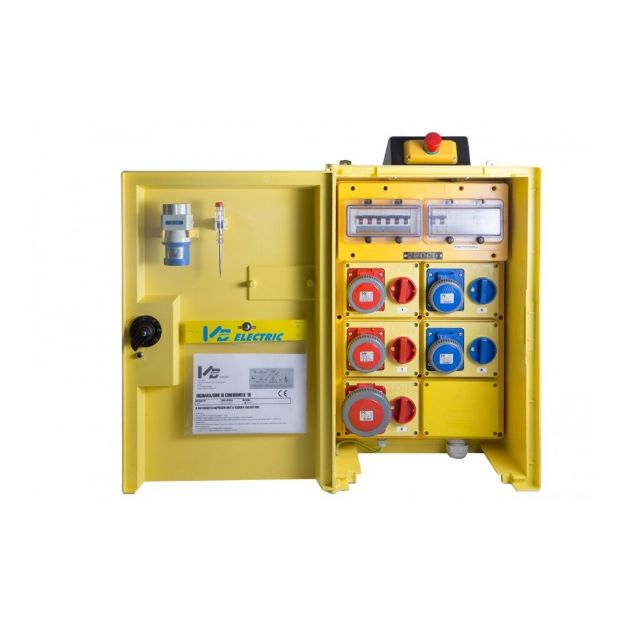 Il quadro e' composto di 5 prese isolate IP67 bloccate e collegate fra loro, protette da interruttore magneto-termico generale da 63A trifase e 40A per il monofase. Le prese sono composte da 2 postazioni industriali a 2 poli +T a 220 volt da 16A, 2 postazioni industriali a 3 poli +T a 380 volt da 16A e da 1 postazione industriale a 4 poli +T a 380 volt da 32A per una potenza massima di 35 Kw .